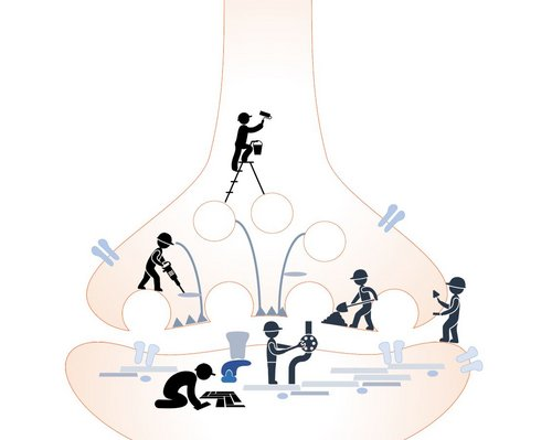 Synapse im Umbau: Diese Grafik zeigt symbolisch, wie „lernende“ Bauarbeiter eine Synapse umgestalten. Beim Lernen werden die Verbindungen zwischen Nervenzellen gezielt verstärkt oder geschwächt.